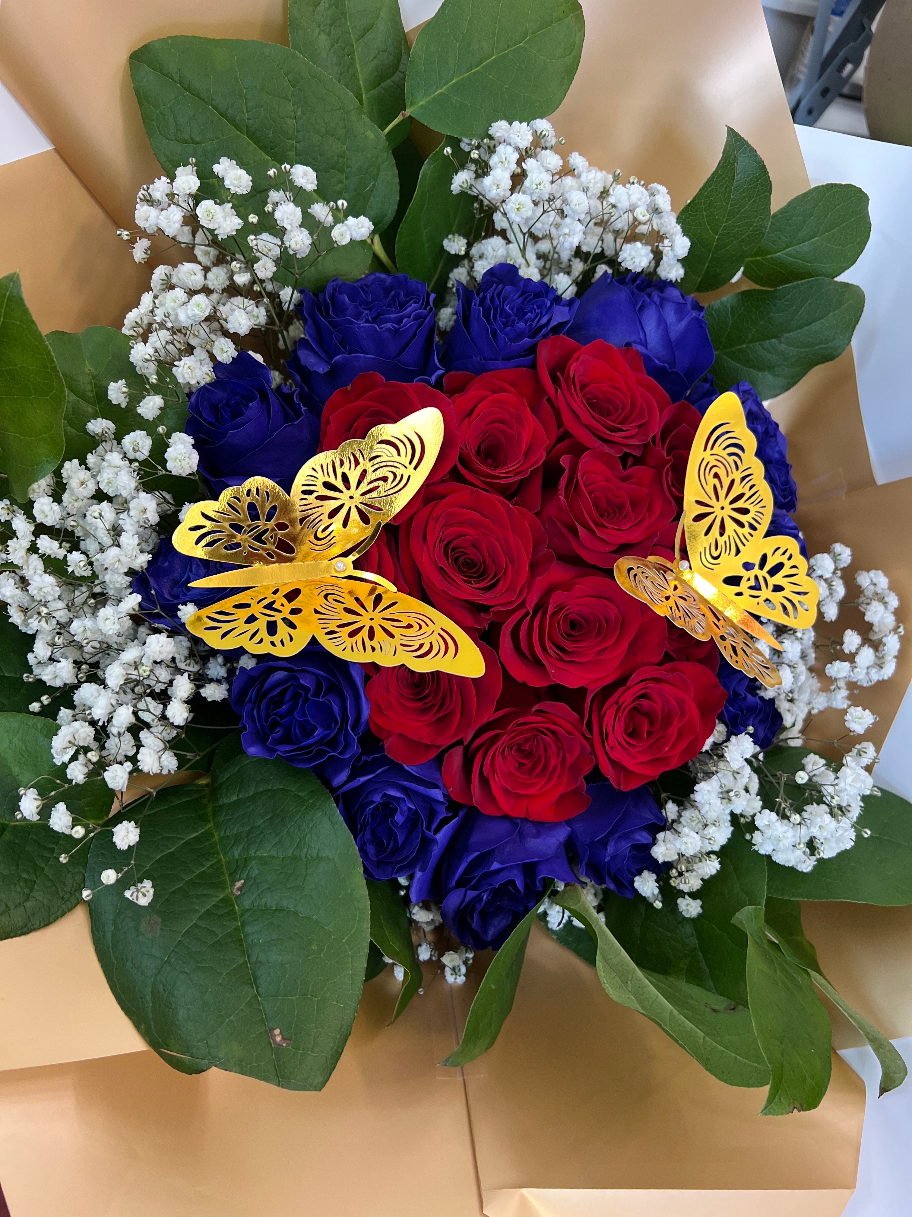 Shop now 🧸Hugs and kisses delivered! Fiery roses, pure carnations, and a golden butterflies fill this bouquet with love.