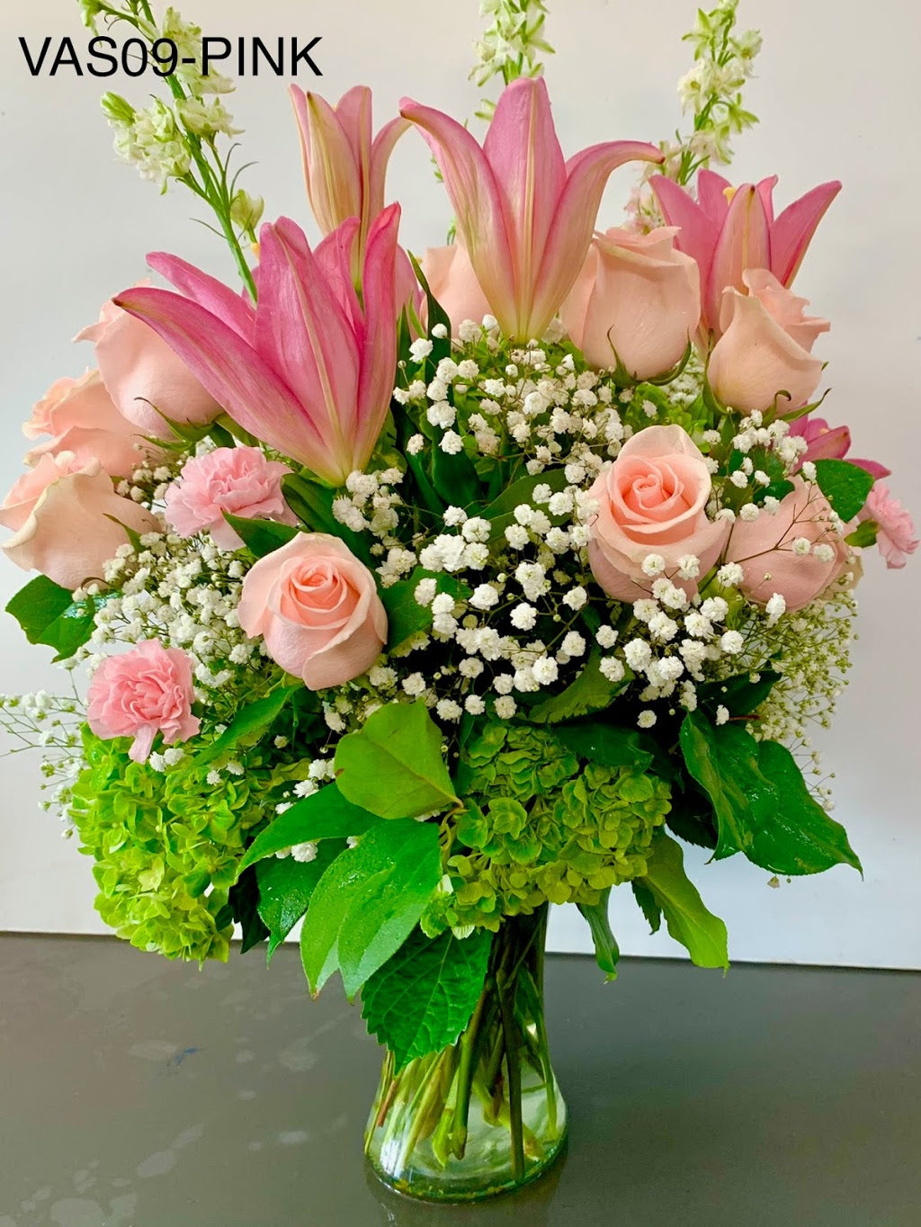 Shop now 🌹Dive into a pink paradise! Soft roses, hydrangeas, lilies, and carnations create a captivating symphony of rosy hues.